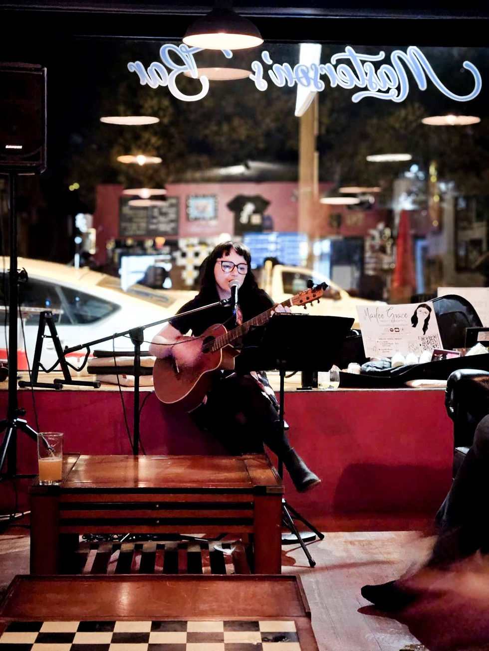 Experience the intimate and cozy music performances captured in various settings, from a rustic venue to a Christmas tree indoors. Feel the warmth and connection as Marlee Grace plays guitar and sings in these unique environments.